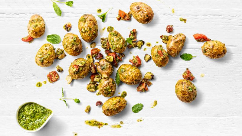 Simple recipes are often the best! Potatoes are an amazing carrier of flavour so this an ideal recipe for foodies. This homemade pesto uses lots of fresh green herbs, which are full of goodness, complemented by sundried tomatoes and crunchy hazelnuts. Delicious by itself or as an accompaniment to grilled meat or fish.