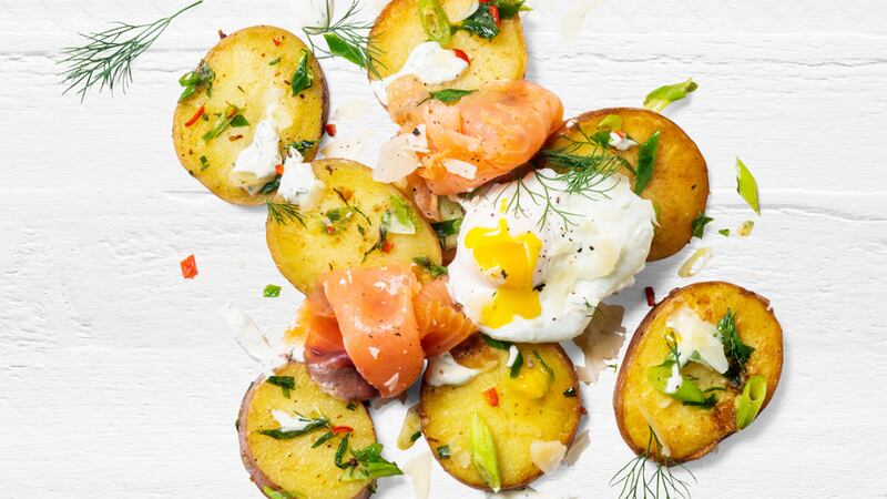 Recipe 1: Zesty potato salad, smoked salmon, poached eggs and sour cream