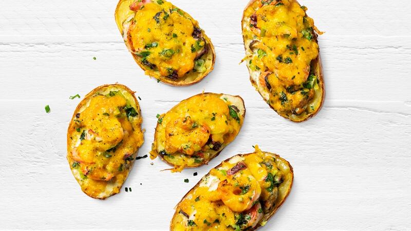 - Fill each potato skin with the seafood filling and place on a baking tray – or use a bun tin.