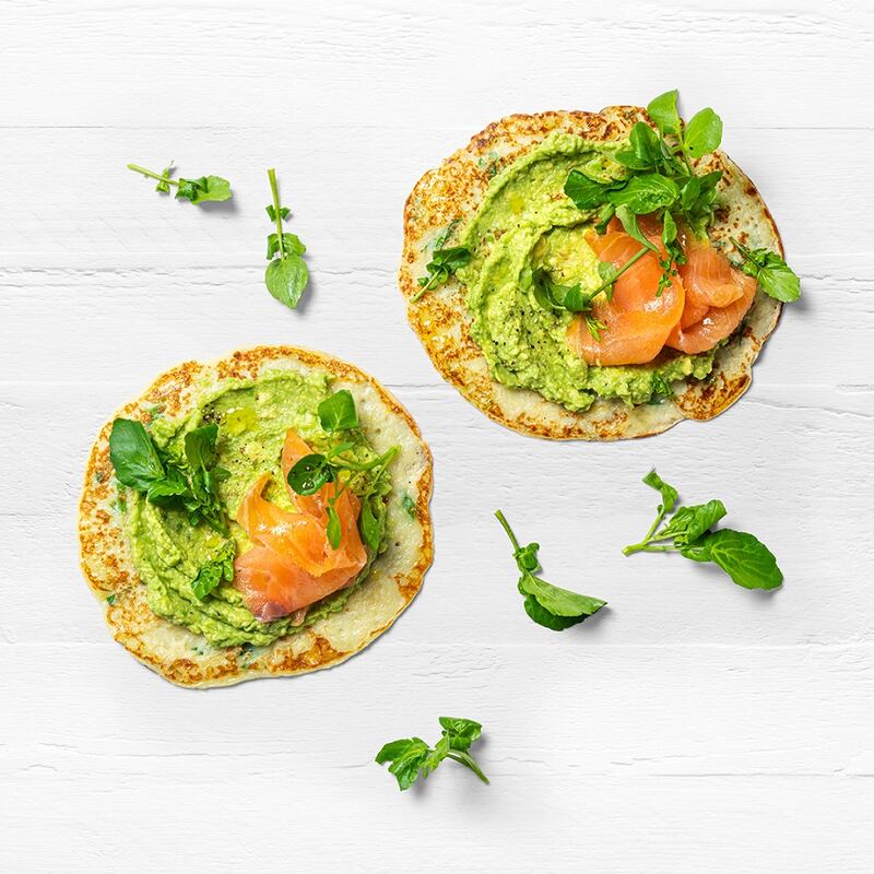 - Place a pancake on each plate, top with the mashed avocado (seasoned with salt, pepper and lemon juice), a handful of watercress and the smoked salmon