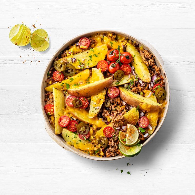 - When the potato wedges are cooked through, cover them as evenly as possible with the beef mixture. Top with grated mature cheddar cheese and cherry tomatoes