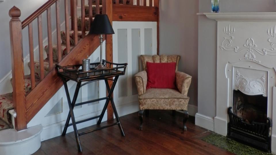 The reception hall is wide, almost a room in itself, with an Art Nouveau cast-iron fireplace. The original grey and white panelled doors with brass latches lead into reception rooms.