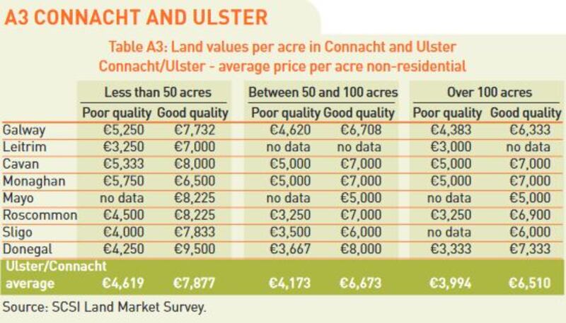 In Connacht/Ulster, where average land quality is poorer than elsewhere, properties are sold in smaller lots, agents said.