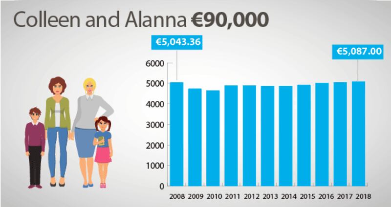 Colleen and Alanna have been living as a couple for over ten years and live in south Dublin with their two children, aged 9 and 11. They formally celebrated and registered their civil partnership in January 2011, following the passing of the Civil Partnership Act. Colleen works as an accountant earning € 90,000. Alanna does not work outside the family home.