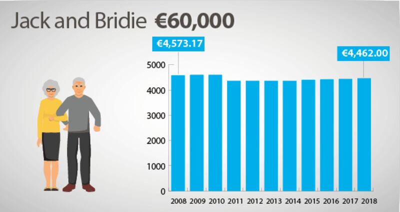 Jack and Bridie are married and living in Cork. They own their family home having paid off their mortgage. Jack and Bridie are in their late 70s. Jack has an occupational pension of € 35,000 and also receives deposit interest and the State Contributory Pension. Bridie receives a pension as a qualified adult. Their total taxable income is € 60,000 per annum.
