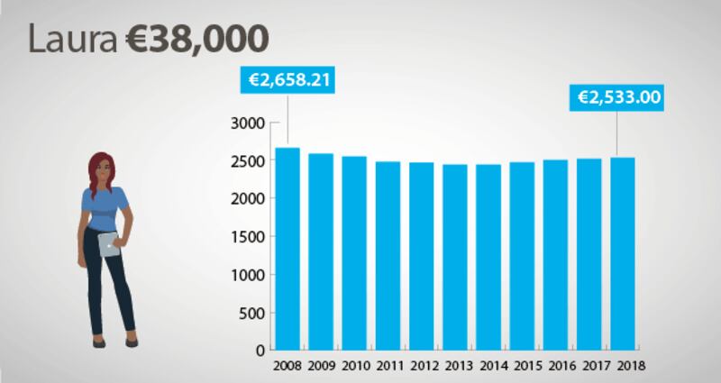Laura is a single 27-year old who lives and works in Silicon Docks in Dublin, where she works long hours in sales for a US tech company, and enjoys a busy social life. Laura earns € 38,000 per annum.