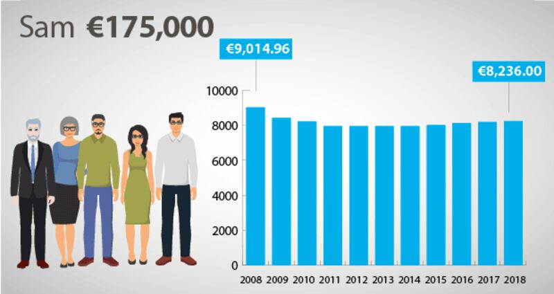 On the other hand, while our baby -boomer Sam, who is self-employed, will also benefit on the tax credit front, thanks to the increase in the earned income credit, he is still stuck with the 3 per cent surcharge on his income over €100,000. This means that while those earning less than €70,044 have seen their marginal rate drop below 49 per cent, he still has to pay a top marginal rate of €52 per cent.