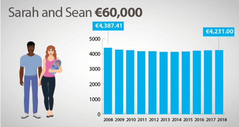 Newlyweds Sarah and Sean are in their early thirties. They live in Kilkenny and are saving hard to buy their first home. Since the arrival of baby Sadhbh, Sean has cut his hours to a three-day week so he can mind the baby, while Sarah has returned to work full-time. Their combined annual income is € 60,000.