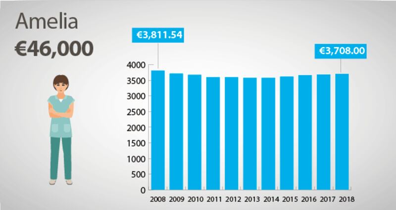 Whilst cleaning out a drawer in their home, Jack came across some payslips and tax statements and noticed how the various tax changes have affected both Bridie and himself during the period. Their total combined net monthly income in 2018 will be higher than it was in 2017. In 2017, their net monthly income was € 4,436, while in 2018 it will be on average € 4,462 per month. This is an increase of € 26 per month.