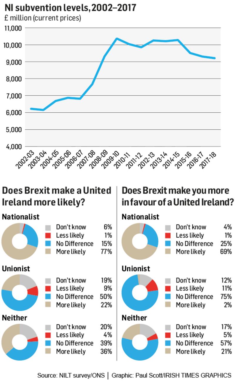 A crunch issue is the financial support from the UK exchequer from Northern Ireland, which rose sharply during the Troubles (see graphic) and is running at a bit over £9 billion per annum, or about €10 billion at today’s exchange rate. This is the gap between the amount the UK spends in Northern Ireland and the tax it takes from there.