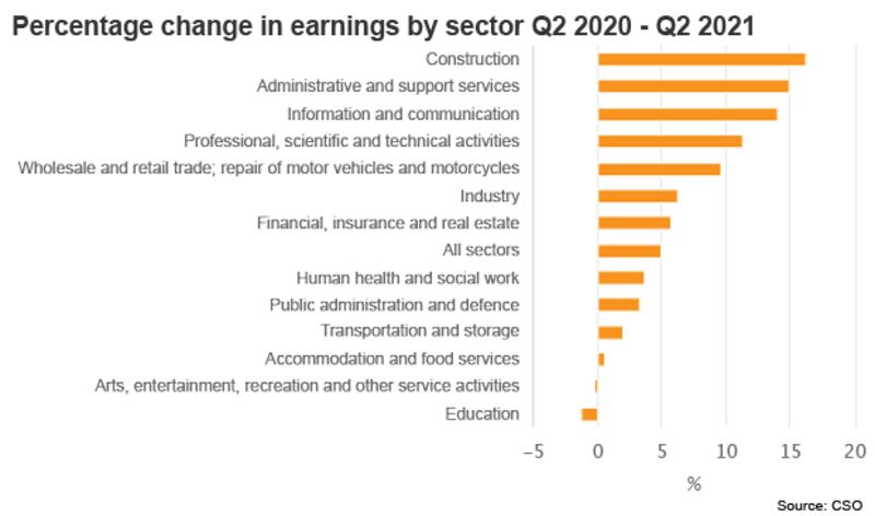 Earnings are on the rise again, at least in some sectors. That is the one of the messages from the latest data from the Central Statistics Office (CSO). Generalising is really difficult, because of the massive swings in the jobs market over the past year and the impact of factors such as Covid lay-offs and wage subsidies. For example in the accommodation and food sectors, huge numbers were on the PUP for much of 2020 and many are now coming back to work. But while the overall picture is clouded, there are clear signs of wages rising in a number of sectors, driven both by longer term trends and the exit from the pandemic.