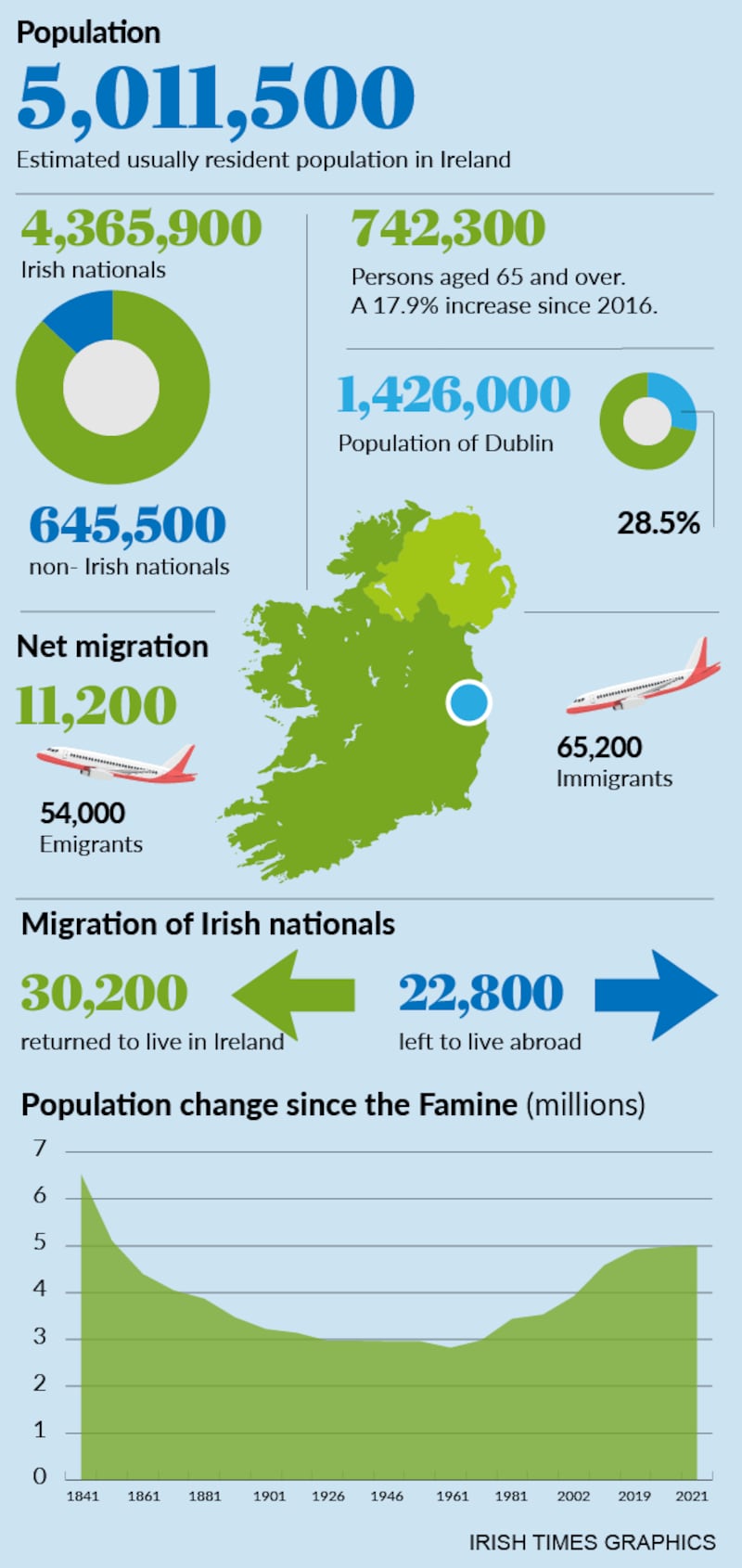 No European country, perhaps no modern country, has experienced a more unique, a more traumatic population trajectory than Ireland. It is the only European country where the population is still lower than it was 170 years ago. Central Statistics Office (CSO) figures, published on Tuesday, put the State's population in April 2021 at 5.01 million. The last time it was over five million was in 1851 when it was 5.11 million. It is also the only country in Europe where the population is 78 per cent bigger than it was just 60 years ago. In 1961, the population was 2.8 million, an all-time low. If you knew nothing of Ireland's history, knew nothing of the Famine or the country's long pattern of emigration or the State's early and persistent economic failures, you could tell something difficult, something tumultuous had happened just from our demographic footprint.
