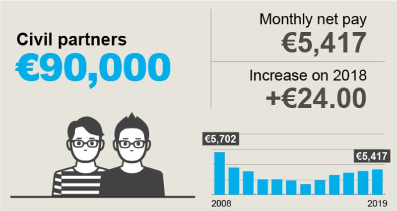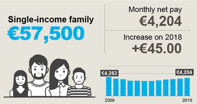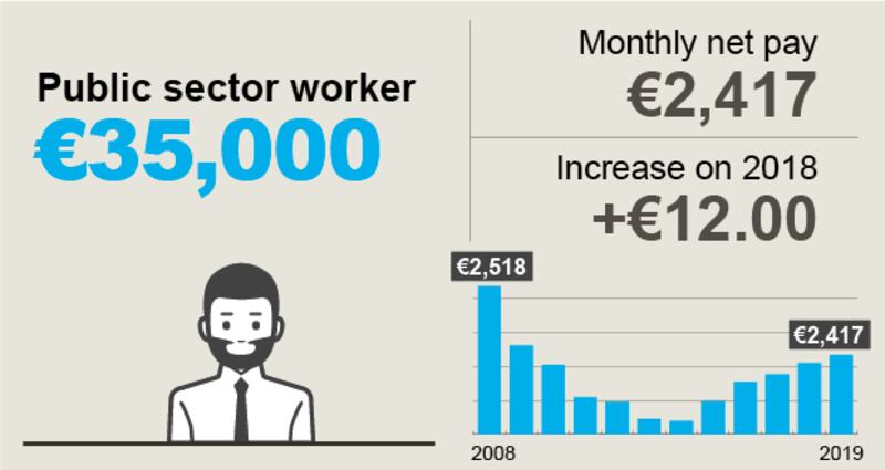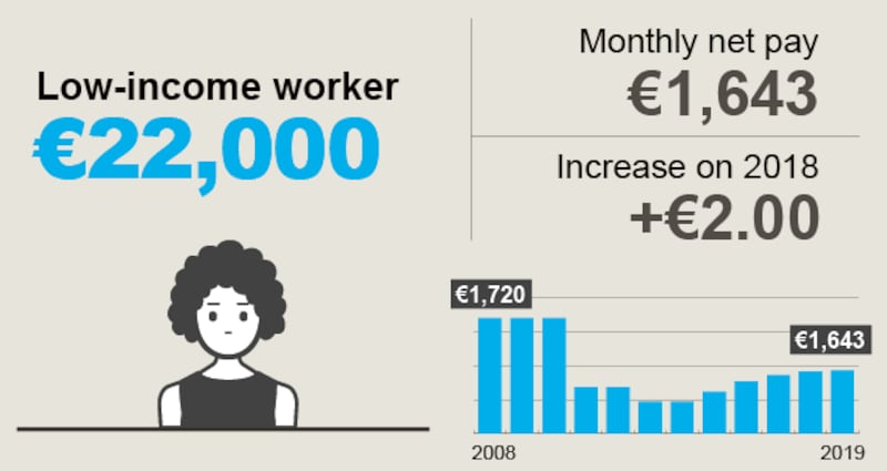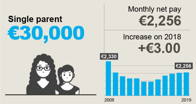 Amie will not feel any benefit in cash terms as a result of the budget, as she has gained just € 3 per month. Looking back over her payslips, Amie notes that there is still a significant difference in her monthly net income in 2008 of € 2,330 to € 2,256 in 2019.