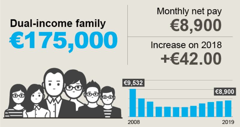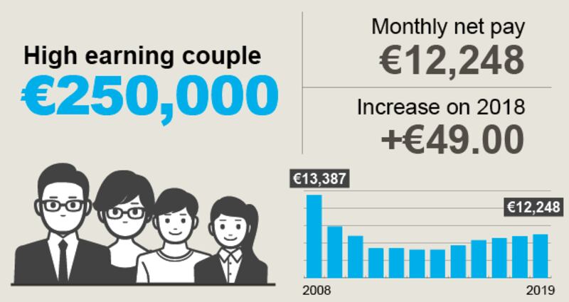 Fred did a comparison of what their net monthly income was in 2008 (including the rent-a-room scheme income to compare like with like). Their net monthly income in 2019 is € 4,205 as opposed to € 4,263 in 2008 , or € 58 less. However, the increases in tax credits and USC changes mean that, comparing 2018 and 2019, Fred and Ellen are better off in 2019 by € 45 per month.