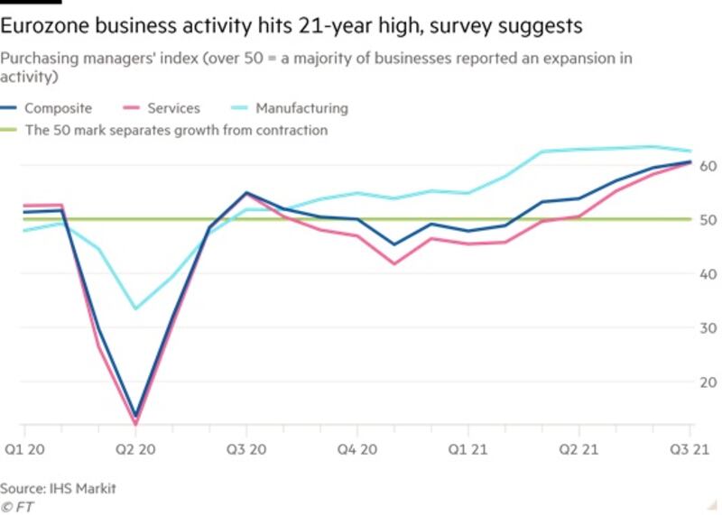 The data indicate that the euro zone economy is growing at a healthy rate after Covid-19 lockdowns were lifted in the spring. Second-quarter output data due to be published next week are expected to show that the bloc has emerged from its double-dip recession, and the PMI figures indicate that the recovery is continuing in the third quarter, economists said.