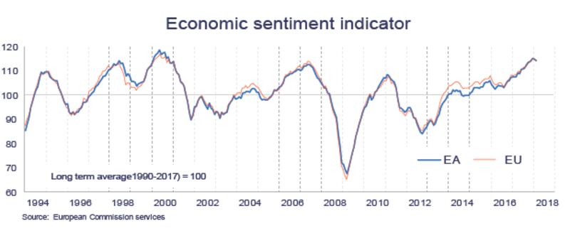 The commission’s overall economic sentiment indicator came in at 114.1, down from 114.9 the previous month but slightly better than economists had predicted.