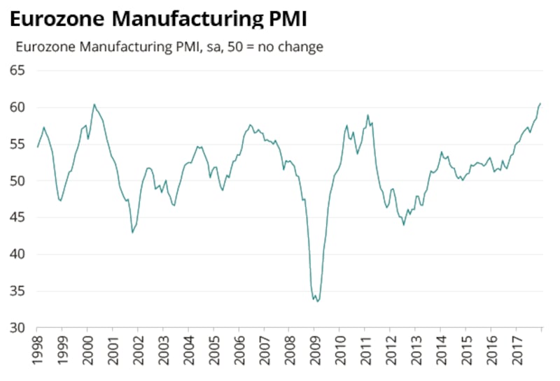 The December euro zone final manufacturing Purchasing Managers’ Index (PMI) was 60.6, matching an earlier preliminary reading, the highest since the survey began in June 1997. Any figure above 50 represents growth.