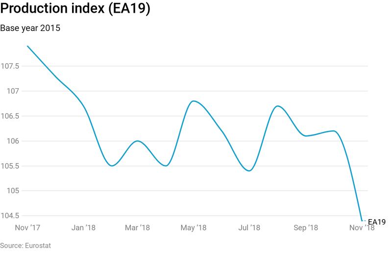 The European Union’s statistics office Eurostat estimated that industrial production in the 19-nation euro zone tumbled by 1.7 per cent in November month-on-month, its worst reading since February, 2016, after a modest, downwardly revised 0.1 percent rise in October.