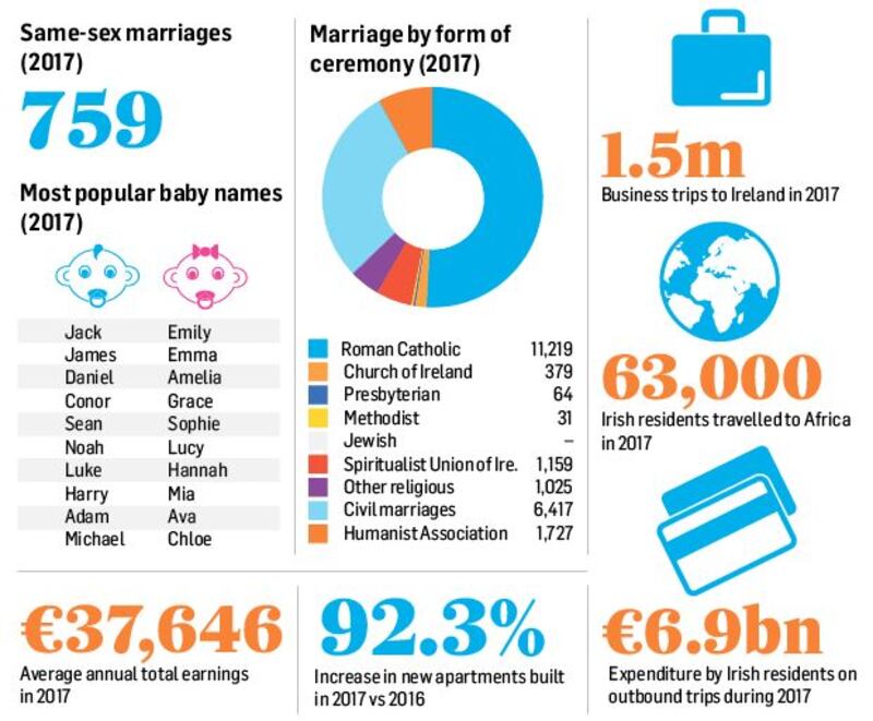 The CSO data also revealed average earnings across the Irish economy in 2017 was €37,646, albeit this figure takes part-time earnings into account. Average annual total earnings were found to vary widely with the highest averages in information and communication, which includes the State’s fast growing IT sector, at €56,757 and financial, insurance and real estate at €55,634.