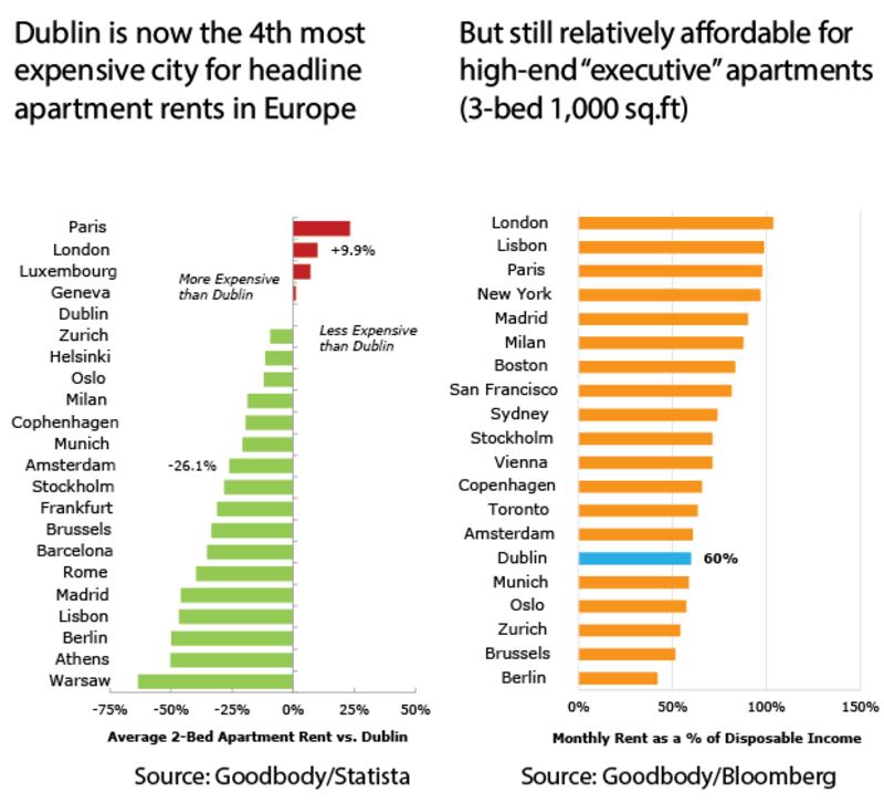 Interestingly, at the other end of the spectrum, the Goodbody analysis finds that for the high-end apartments – three-bed luxury apartments in the Docklands, for example – Dublin is not particularly expensive compared with other major cities. People at the higher income levels looking at such properties can afford to spend a higher percentage of disposable income on accommodation and still have plenty left to live on.