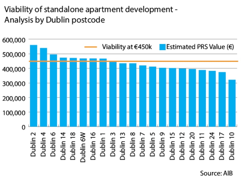 AIB's analysis, based on an apartment selling price of €450,000 which is seen as a rough guide to what is needed to deliver a return to the developer, shows that outside Dublin 2, 4 and 6, viability is challenging at best, and absent in many cases. Income levels simply do not support the apartment price necessary to get a return, given the income limits imposed on borrowers by Central Bank rules. Meanwhile, in Cork, incredibly, no apartment block has been completed in the past decade, though a number are now in development.