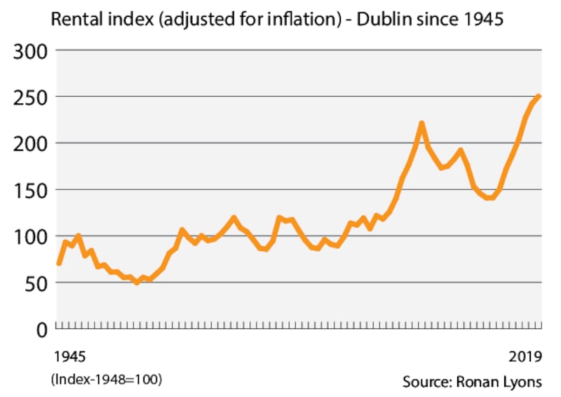 The debate about housing costs frequently involves older generations pointing out that housing was also expensive when they were starting out. However, research by TCD economist Lyons suggested that, looking at rental levels going back to the 1940s, the inflation-adjusted cost is now clearly at a peak. Only now, as rental growth slows, will income growth – for some at least – move ahead, thus slowly improving affordability. For this process to accelerate, rents would have to actually fall, which could of course happen, but typically has only done so during a wider economic crisis which also puts pressure on incomes. A consistent increase in supply, at the right price levels, would be the only way to break the cycle. And the risk – in the current market structure – is that falling rents would in themselves hit supply by lowering returns for landlords, either private landlords or the big institutional investors now becoming more important in the market.
