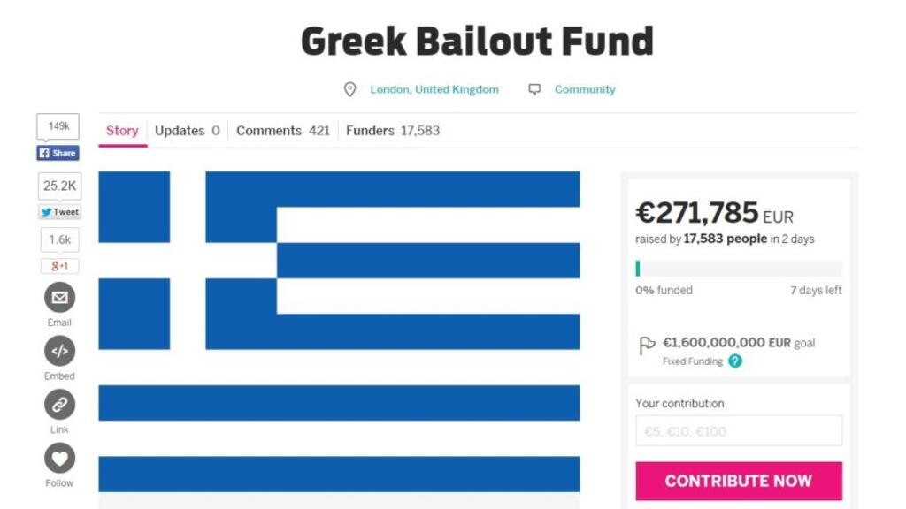 Pledge €3 euro and you’ll receive a postcard of Greek Prime Minister Alex Tsipras, pledge €6 and receive a Greek feta and olive salad right to your door. If you’re feeling generous, donate €5,000 to receive an all inclusive holiday for two in Athens for a week.