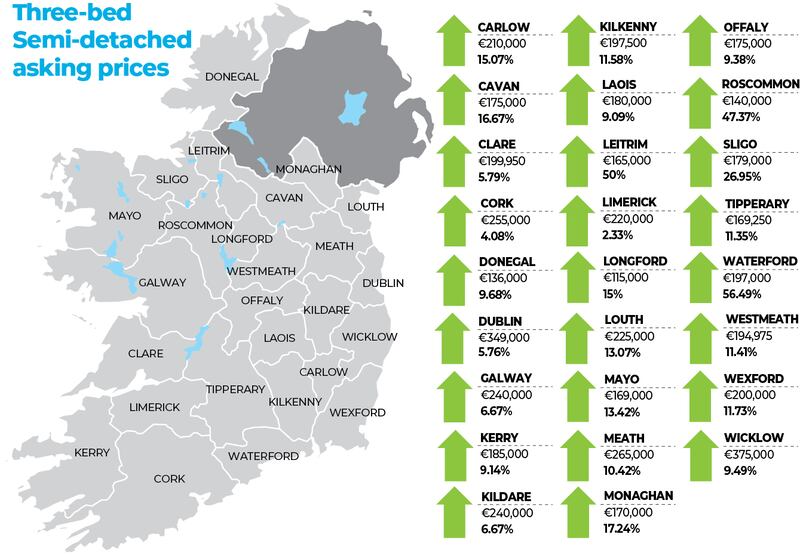 This put the median or typical asking price for a home nationally at €295,000, and at €385,000 in Dublin.