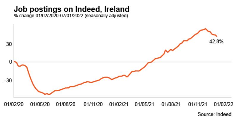 This is not unique to Ireland, but the relatively strong growth in many sectors is adding to wage pressures. Despite Omicron, Indeed, the jobs website reported that jobs postings in Ireland on January 7th, 2022, were up 43 per cent on levels just before the pandemic hit.
