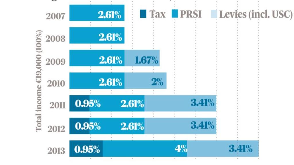 Her earnings are €19,000 per annum. Cleo is worried about the forthcoming Budget. She has looked at her net income from 2007 to judge the impact that successive austerity Budgets have had on her income. In 2007, her net monthly income was €1,542. But this has reduced to €1,441 by 2013. In total, this represents a net monthly decrease of €101.