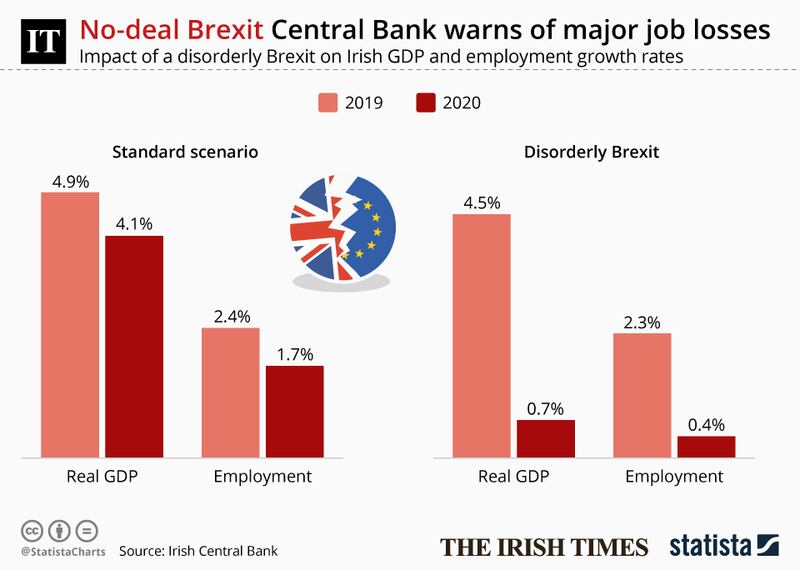 The new figures show just how alarming the prospect of a no-deal Brexit has become. Just over two years ago, the Central Bank’s then chief economist Gabriel Fagan said that 40,000 jobs could be lost over a 10-year period in the event of a no-deal Brexit. That’s a significant change.