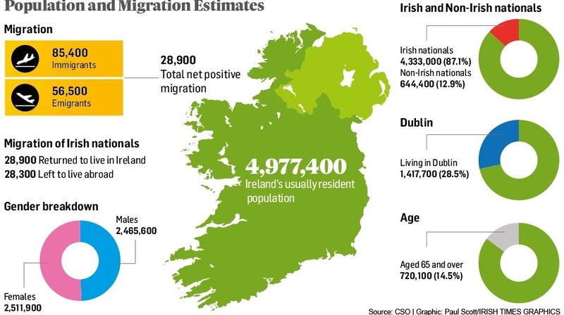 Figures published by the Central Statistics Office (CSO) show the overall population rose by 1.1 per cent, or 55,900 people, year-on-year to 4.98 million.