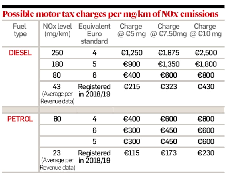 This charge would be put on the price of the new car - or the tax charged when importing a used car. It could range from €5 per mg of NOx up to €10. The average new diesel car has an NOx of 43mg/km. That would mean a charge of either €215 or €430, depending on which rate the Minister for Finance cares to apply. For new petrol cars, which average 23 mg/km, the surcharge could be €115 or up to €230.