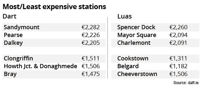 Elsewhere on the Dart, Pearse (€2,226); Lansdowne Road (€2,175); Dalkey (€2,205) and Grand Canal Dock (€2,145) make up the top five most expensive stops to live close to. The cheapest location are Bray (€1,475); Howth Junction and Donaghmede (€1,506); and Clongriffin (€1,511).