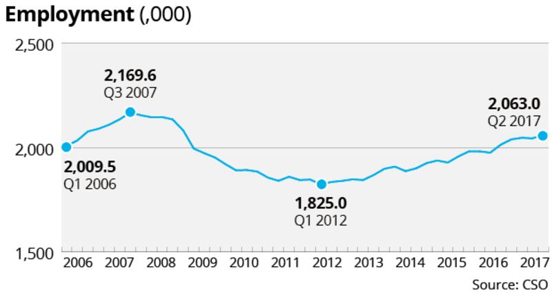 The total number of people at work is one of the best and most up-to-date measures. Huge job losses – first in construction and then across almost every sector – caused a big hit to the economy when the crisis broke. The recovery in employment in the last few years has been one of the more encouraging indicators.