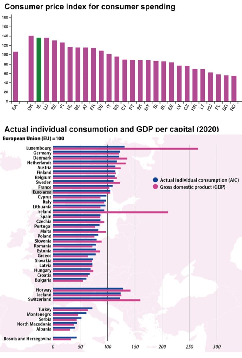 The latest EU figures measure what is called Actual Individual Consumption (AIC). This is the amount of money people spend on goods and services plus a calculation on what they receive in individual services from the State in areas like health,education and housing.