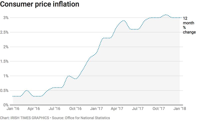 Consumer price inflation held at an annual rate of 3.0 per cent in January, unchanged from December, after hitting its highest since March 2012 in November at 3.1 percent, the Office for National Statistics said. Sterling rose after Tuesday’s data and was up by 0.5 percent against the dollar at 1035 GMT. British government bond prices fell in contrast to a rise in the price of German bunds.