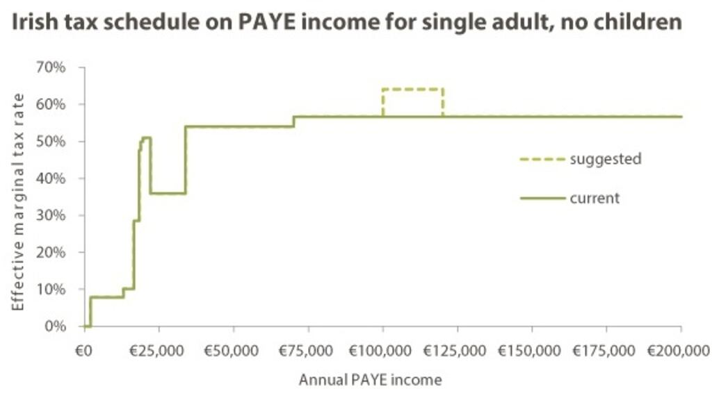 A Government proposal to taper the PAYE credit would create an effective marginal tax rate of 64.1 per cent on income of between €100,000 and €120,000, a UK independent research institute has warned.