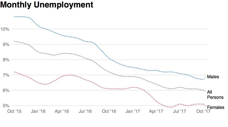 The latest numbers the seasonally adjusted unemployment rate for male workers was 6.7 per cent, down from 8.1 per cent this time last year, while the jobless rate for women was 5.1 per cent, down from 6.1 per cent 12 months ago.