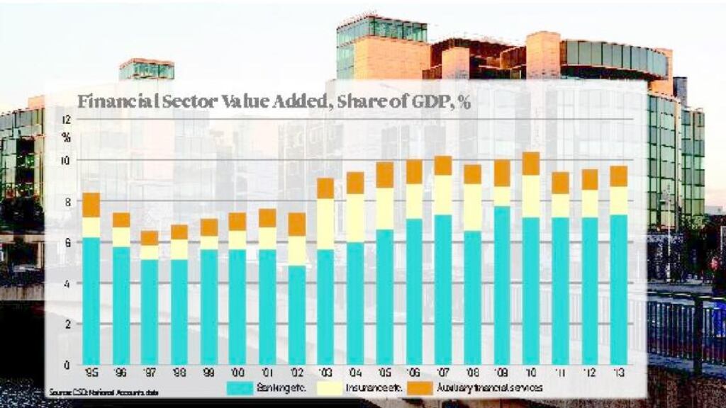 However, as discussed in series of Central Bank papers, our financial sector is big relative to the size of the economy, accounting for about 10 per cent of value added (see graph, above). In a more normal economy it might account for about 4 per cent of value added.