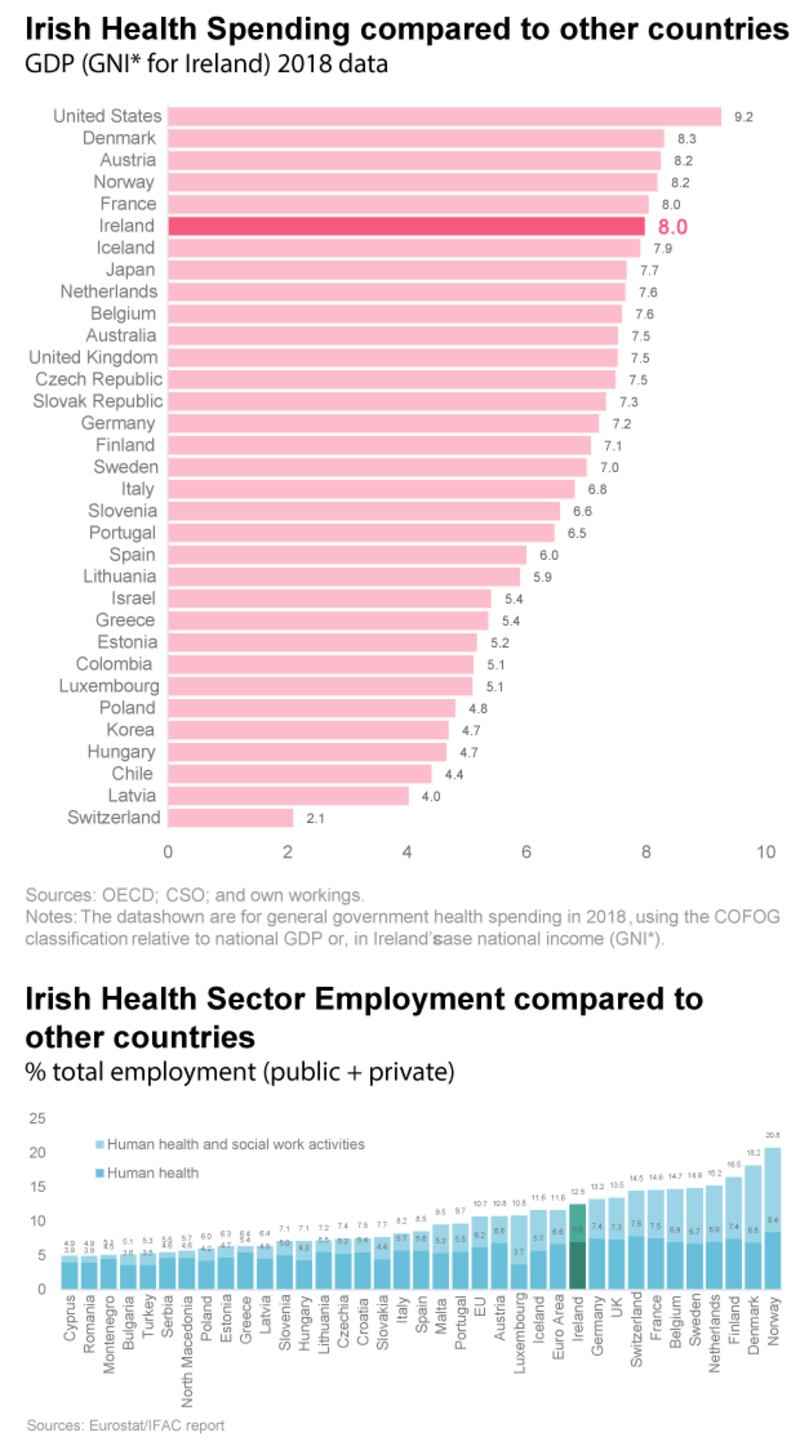 A 2021 ESRI paper by Maev-Ann Wren and Aoife Fitzpatrick looks at some different measures by comparing health spending. It looked at total healthcare spending by both the private and public sector, and so differs from IFAC which focused on Government spending. It shows that in 2017 health spending in Ireland as a percentage of national output was the highest in the EU. But looking at per capita spending and adjusting it for the different price levels in different countries dropped Ireland down to ninth. This gives an indication, they say, of the actual amount of health services from which people benefit – and the impact of higher prices and costs in Ireland.