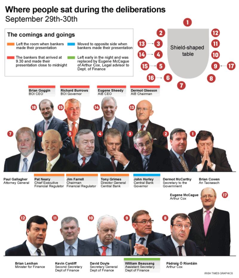 Taoiseach Brian Cowen, minister for finance Brian Lenihan, head of financial regulation Patrick Neary, Central Bank governor John Hurley, government officials, legal advisors and the chairmen and chief executives of the country’s two largest banks gathered in Government Building as Anglo Irish Bank teeters on the brink of default.