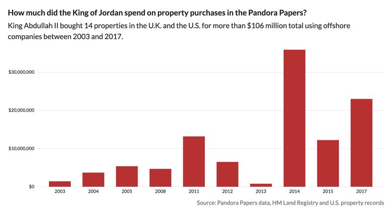 They show that Jordan’s monarch, King Abdullah II, purchased 14 luxury homes, worth more than $106 million, in the US and the UK. Advisers helped him set up at least 36 shell companies from 1995-2017.