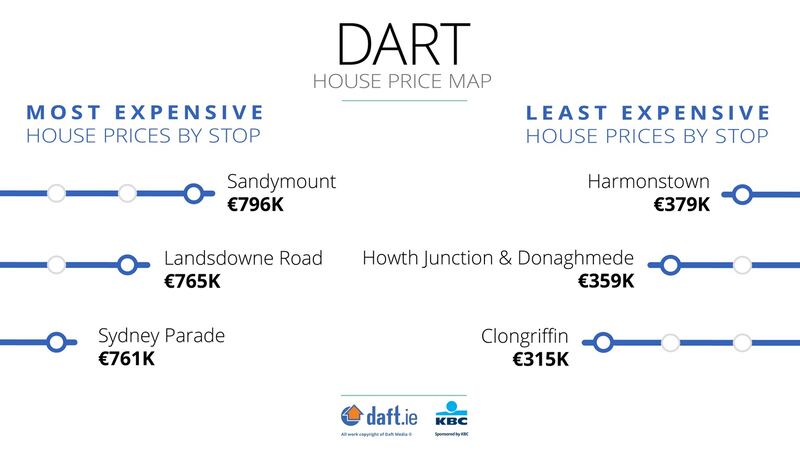 Commuters on the Dublin south coastline pay on average the most for a property close to a Dart station, with prices averaging €625,000. House prices close to Sandymount (€796,000) topped the survey on the Dart line, followed by Lansdowne Road (€765,000), Sydney Parade (€ 761,000) and Blackrock (€734,000). Cheapest on the Dart are Clongriffin (€319,000); Howth Junction and Donaghmede (€359,000) and Harmonstown (€397,000).