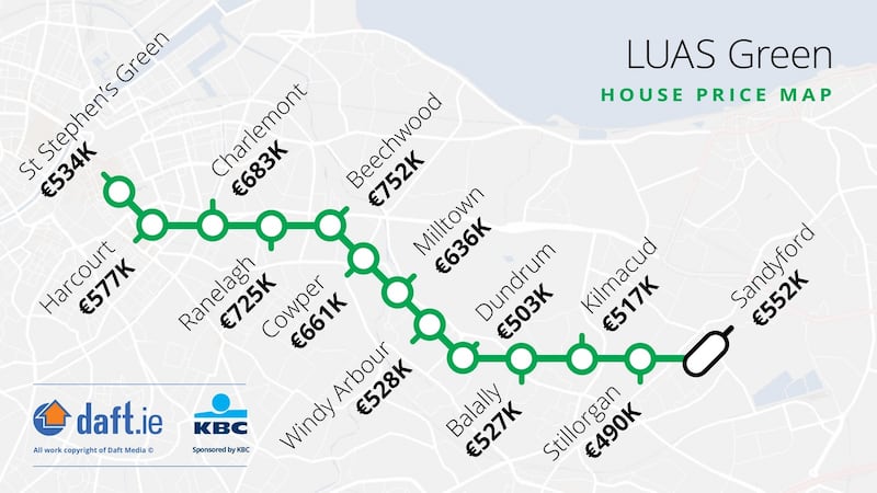People living along the Green Line have some of the priciest property in the capital as 16 of the 27 stops have average property prices in excess of half a million euro.
