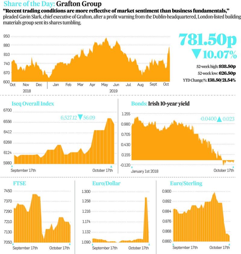 Dublin-headquartered Grafton Group fell more than 10 per cent after a profit warning.