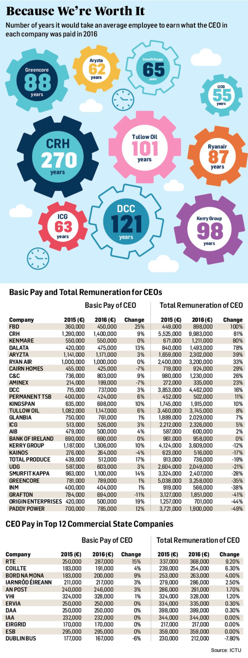 The report – Because We're Worth It: The Truth about CEO pay in Ireland – was carried out by the Irish Congress of Trade Unions (Ictu). It documented pay rises for some chief executives of up to 100 per cent between 2015 and 2016, and a near doubling of cash bonuses in some cases.