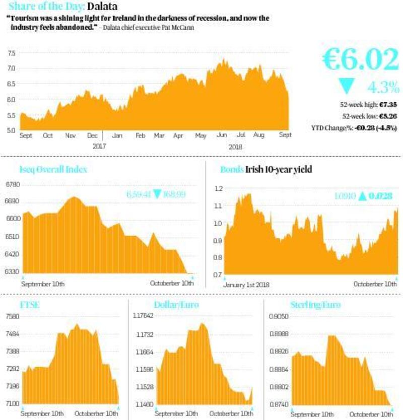The Iseq experienced one of its biggest one-day falls of the year, dropping 174 points to 2.7 per cent to 6,153. Hotel group Dalata was down more than 4 per cent at €6.02 a day after Minister for Finance Paschal Donohoe removed the hospitality sector's preferential rate of VAT. "Tourism was a shining light for Ireland in the darkness of recession and now the industry feels abandoned," said Dalata chief executive Pat McCann. Iseq heavyweight Ryanair fell nearly 3 per cent to €11.41. There is speculation the airline will announce a raft of new routes this week.