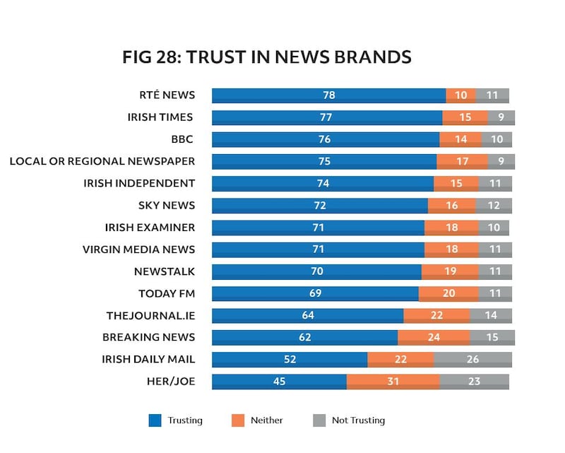 RTÉ has come out on top as the “most trusted news brand” at 78 per cent, while The Irish Times is a point behind on 77 per cent.