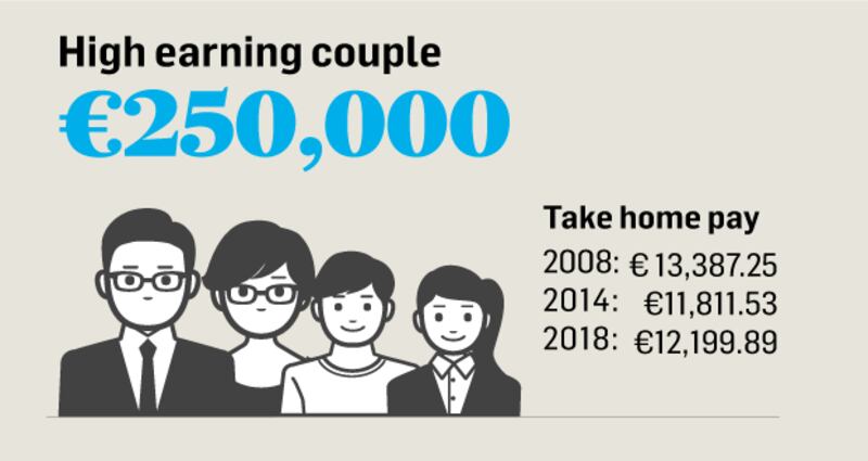 Interestingly, however, the decline in their take-home income is not down to income tax; they are actually paying €732 less a year in income tax, thanks to the decrease in the higher rate of tax to 40 per cent in recent years. Their higher tax burden is rather down to higher rates of PRSI, as well as USC, being imposed on them.